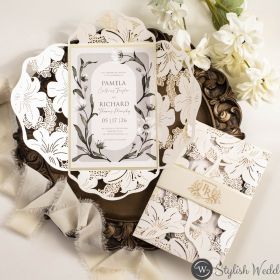 Ivory Laser Cut Pocket Wedding Invitation With Floral And Champagne Gold Glittery Backer Swws333