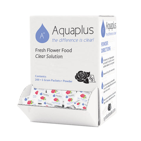 Feed your flowers so they can flourish with our 5-gram Aquaplus Packets! These single-serving size packets of Aquaplus powder make feeding your flowers easy. Mix each packet with 16oz of water to see that The Difference Is Clear with Aquaplus! A point-of-purchase display offers a pop-out tray for quick access. Features Single Box of 200 Packets or 8 Boxes of 200 packets per box Helps flowers fully open and maintain energy Promotes water uptake in stems Keeps water clear Use for sympathy arrangements, centerpieces & more Made from recycled materials Case Dimensions Height - 12 in Length - 19 in Width - 13.5 in Weight - 23.2 lbs