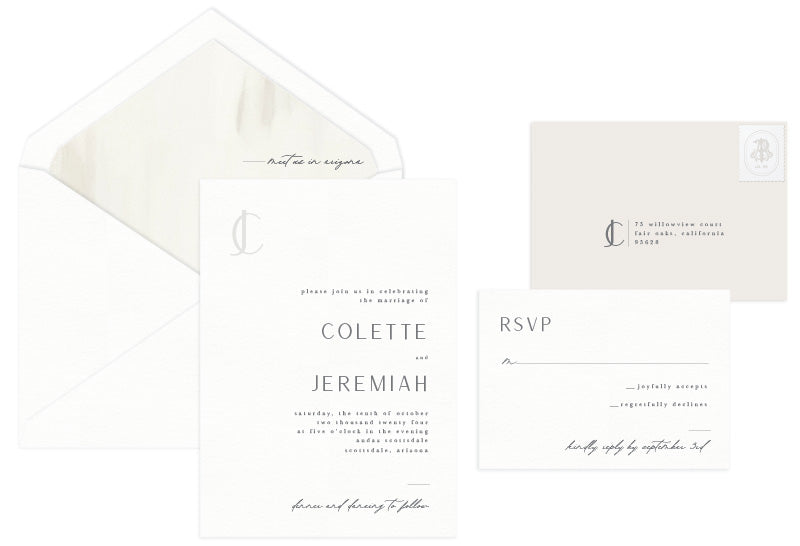 Laszlo Product Details As Shown... Card Size: 5" X 7" Font: Versailles + Baskerville + Plume Ink Color(S): Meteorite + Blind Deboss (Monogram Only) Printing Type: Letterpress & Fine Art Digital Customization Ready To Make It Yours? Visit Our Customization Guide To Explore All The Ways You Can Tailor This Design To Your Personal Wedding Style. Pricing Visit Our Easy-To-Use Pricing Calculator For A Custom Quote. View Pricing Booking To Provide Thoughtful And Attentive Service To All Our Couples, We Book A Maximum Of 12 Weddings Per Month. We Suggest Booking Early! Check Our Availability What'S Next? Check This Set Out In Person! Click Below To Order A Sample Package Delivered Right To Your Doorstep. Order Sample Kit Tags: Modern + Minimalist Design Notes: The Laszlo Design Is Modern And Minimalist -- Inspired By Sparse Sonoran Landscapes, Clean Lines, Neutral Layering Tones And Textured Canvas Paintings.