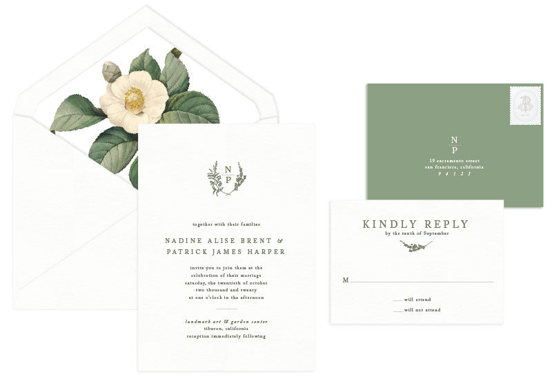 Amador Product Details As Shown... Card Size: 5" X 7" Font: Caslon Ink Color(S): Moss Printing Type: Letterpress & Fine Art Digital Customization Ready To Make It Yours? Visit Our Customization Guide To Explore All The Ways You Can Tailor This Design To Your Personal Wedding Style. Pricing Visit Our Easy-To-Use Pricing Calculator For A Custom Quote. View Pricing Booking To Provide Thoughtful And Attentive Service To All Our Couples, We Book A Maximum Of 12 Weddings Per Month. We Suggest Booking Early! Check Our Availability What'S Next? Check This Set Out In Person! Click Below To Order A Sample Package Delivered Right To Your Doorstep. Order Sample Kit Tags: Classic + Botanical Design Notes: The Amador Design Is Inspired By The Natural Landscapes Of Northern California With A Southern Heirloom Feel. We Love The Delicate Floral Monogram And Hand-Illustrated Botanicals On Each Piece.