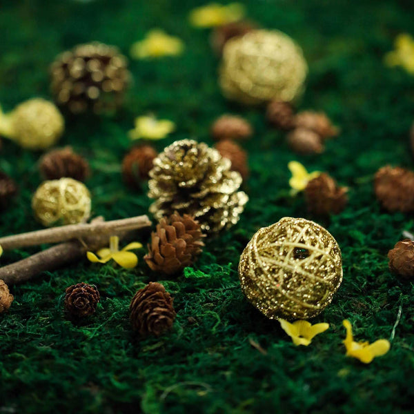 Perfect for accenting your green home, these assorted ornaments with unique natural texture can be used in a variety of ways. Fill your decorative vases with these cute fillers to create a perfect table centerpiece for your wedding, party, events or to compliment any room in your home. Fill a decorative bowl or vase, string them on jute and hang them, or even scatter them across a nature-inspired dining setting. WHAT YOU GET: Each order is for twenty six (26) assorted ornament fillers. Measurements: 17 small natural pine cones: approx. 1 inch long x 1 inch wide. 3 large natural gold glittered pine cones: approx. 3 inches long x 2 inches wide. 2 natural twigs: approx. 4 inches long x 1 inch wide. 2 small gold glittered rattan balls: approx. 1 inch in diameter. 2 large gold glittered rattan balls: approx. 2 inches in diameter. Material: Natural rattan, twigs and pine cones. Other decorations are not included.
