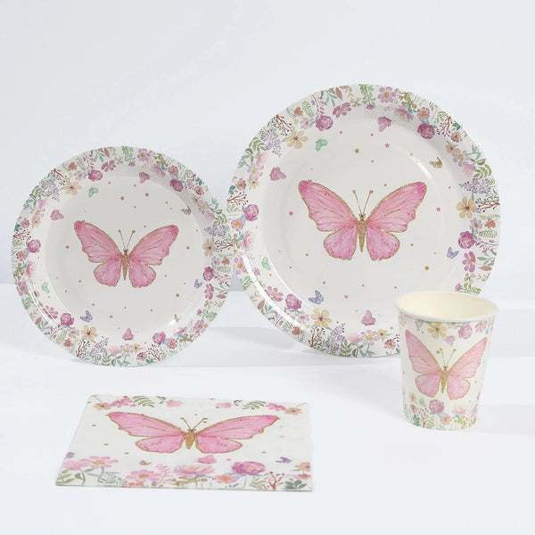 96 White and Pink Butterfly Print Paper Tableware Party Supplies Set