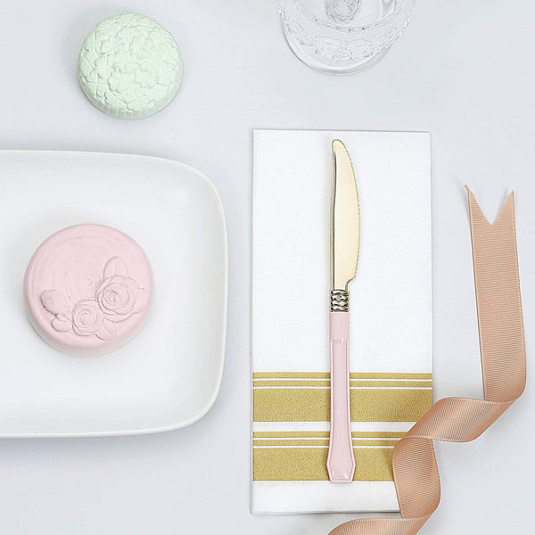 Entertainment just got easier. Serve your guests using these upscale design knives and let your great food speak for itself. Purchase disposable tableware and celebrate your special day with ease. This set includes 24 plastic knives so you're sure to create the perfect table setting. These disposable utensils are a great choice for fine dining occasions like wedding, dinner party, holiday dinner, bridal shower, reception, baby shower, birthday party and more. WHAT YOU GET: Each order is for twenty four (24) knives. Measurements: Length: approx. 7 inches. Thickness: approx. 3mm. Material: Plastic. This item is BPA Free. Other decorations are not included.