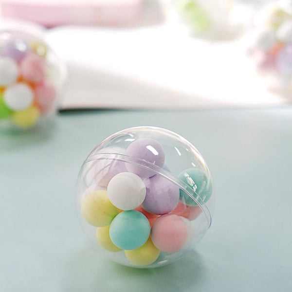 Entertainment just got easier. Serve your guests using these individual plastic mini ornament balls and let your great food speak for itself! These cute orbs are the ideal favor holders for baby showers, kid's birthday parties, weddings, graduations or any special events! Each favor holder is made from high-quality plastic with an elegant, crystal clear sphere-shaped design. Perfect for presenting your small treats, party favors, candies, chocolates or any gifts you can think of. Use them as decorative accents to bring a fun and festive atmosphere to your celebration. The possibilities are endless! WHAT YOU GET: Each order is for twelve (12) mini ball favor holders. Measurements: Ball diameter: approx. 3 inches. Thickness: approx. 1mm. Each ball has two parts. Easily separate to open and attach together to close. Top loop for easy hanging. Material: Plastic. Candies and other decorations are not included.