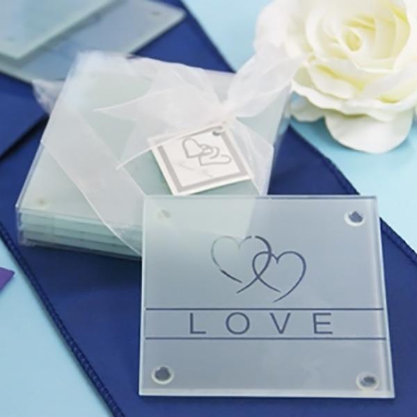 The charming clear glass design and square shape let these coasters blend in with any ensemble, while the beautifully etched two hearts add a personalized touch. Guests can place their drinks on tables knowing that your tables are safe and take them home afterwards as a souvenir. These wedding favors also make great bridesmaid gifts and keepsakes. These glass coasters also come with a gift box, ribbon and thank you card for easy decorating! WHAT YOU GET: Each order is for four (4) coasters. Size: approx. 3" x 3". Material: Glass. All 4 coasters are packaged in a gift box with ribbon and Thank You card. Other decorations are not included.