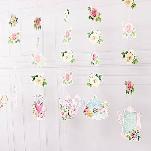 Dress up any space in an instant with cheerful tea cups paper garlands! Create a fun and festive atmosphere for your special day by using this sweet paper garland as a wall backdrop accent for your photo station. Perfect for bridal showers, garden parties, baby showers, and more, these garlands are crafted with meticulous attention to detail and a touch of whimsical charm. Floral garlands are perfect for creating colorful memorable moments with loved ones. WHAT YOU GET: Each order is for eight (8) paper garlands. Measurements: Length: approx. 40 inches. Each flower: approx. 3" tall x 4" wide. Each teapot: approx. 5" tall x 6" wide. Materials: Cardboard Paper. Balloons, greenery and other decorations are not included.