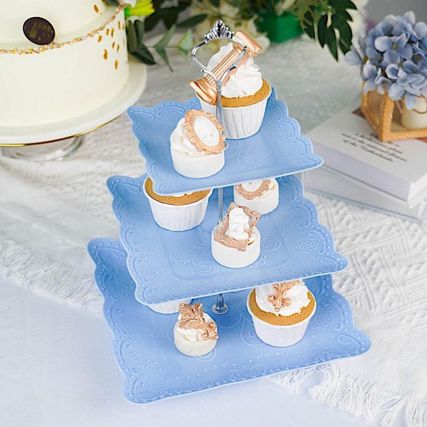 Celebrate your day with something that is both decorative and functional! This plastic cupcake holders stand will make a stylish dessert display for your weddings, birthdays, parties or any special gatherings. With 3 wavy edge square trays to fill with cupcakes, muffins or any sweet treats, this floral printed display stand will elevate the look of your dessert tables. Pair with flowers arrangements and backdrops for an outstanding dessert table decoration. Great for birthdays, weddings, parties or any special gatherings. WHAT YOU GET: Each order is for one (1) cupcake stand. Measurements: Height: approx. 13 inches. Width: approx. 9.5 inches. Bottom tray size: approx. 9.5 x 9.5 inches. Middle tray size: approx. 7.75 x 7.75 inches. Top tray size: approx. 5.75 x 5.75 inches. Distance between trays: approx. 4 inches. Tray center hole diameter: approx. 0.25 inch. Material: Plastic. Metallic connector with a top handle for easy carrying and handling. Requires a small assembly. Shipped with a bag of tools containing 8 washes, 3 stand connectors and 1 nail. Cupcakes, desserts and other decorations are not included.