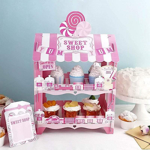 Celebrate your day with a decorative and functional sweet shop dessert stand! This sturdy sweet shop cardboard cupcake holder will help to serve your cupcakes, desserts and sweet treats with style and charm. Use the mini display stand to write your sweet messages, tags or any personalized notes. Just the perfect addition to your dessert tables! This cupcake stand is great for kid's parties, birthdays, summer getaways, baby showers and events. WHAT YOU GET: Each order is for one (1) cupcake stand. Measurements: Total size: approx. 18 inches tall x 12 inches long x 7.25 inches wide. Bottom tier: approx. 4.25 inches tall x 11.25 inches long x 5 inches wide. Top tier: approx. 6.25 inches tall x 11 inches long x 7.25 inches wide. Mini display stand: approx. 5.75 inches long x 4 inches wide. Thickness: approx. 1mm. Cardboard quality: 400 GSM. Material: High quality cardboard. Small assembly is required. Shipped with instructions. Cupcakes and other decorations are not included.