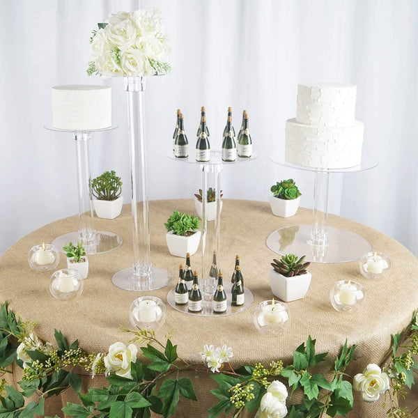 Decorate your special day with our Cupcake stand! Our Cupcake stand is great for weddings, parties, events or simply using it in your own home. WHAT YOU GET: 2 x 16" Round Plates with 1 x 6" tall tube. 2 x 12" Round Plates with 1 x 8" tall tube. 2 x 8" Round Plates with 1 x 12" tall tube. 2 x 6" Round Plates with 1 x 18" tall tube. Material: Made with durable acrylic, plasticmaterial. Other decorations are not included. Our tubes are clear acrylic, which means you can decorate the inside of the tube with theme color flowers, LED lights, battery lights, or other colored items to match your theme. Cake, candle holders and other decorations are not included. Please note these are approx figures, there are no specific spacings on the stand, so how many can fit depends on the size of the cupcakes, how it's spaced out, and whether if it's suitable to use all tiers under certain wind conditions.