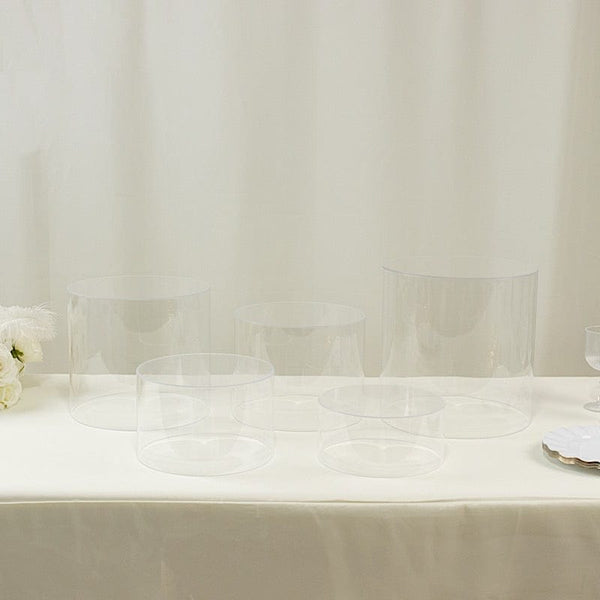 Stay stylish in any setting with this simple yet elegant acrylic cake stand! This transparent, multipurpose display stand with an open bottom is perfect for making a unique presentation of cakes, desserts and lovely decorations. Create your own centerpiece design by pairing it with your charming flower arrangements, candles or LED decors and anything you can think of. This round dessert display stand is great as a cake, cupcake and dessert pedestal for your weddings, parties and events. The possibilities are endless! WHAT YOU GET: Each order is for five (5) cake stands. Measurements: Extra small stand: approx. 4 inches tall x 8.5 inches wide. Small stand: approx. 6 inches tall x 9 inches wide. Medium stand: approx. 8 inches tall x 10 inches wide. Large stand: approx. 10 inches tall x 11 inches wide. Extra large stand: approx. 12 inches tall x 12 inches wide. Thickness: approx. 0.12 inch. Weight capacity: Can hold up to 20 lbs. Material: Acrylic. The hollow bottom allows you to decorate under the cake. Remove the protective film before use. Wipe lightly with a damp cloth to clean. Cakes, LED lights, candles and other decorations are not included.