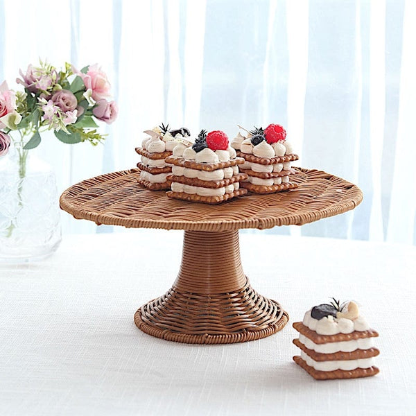12 in Natural Round Plastic Rattan Wicker Pedestal Cake Stand