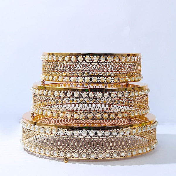 3 Gold Pearl Beaded Metal Cake Stands with Mirror Top