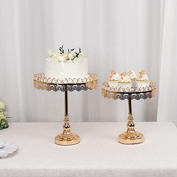 2 Gold Crystal Beaded Metal Pedestal Cake Stands with Mirror Top