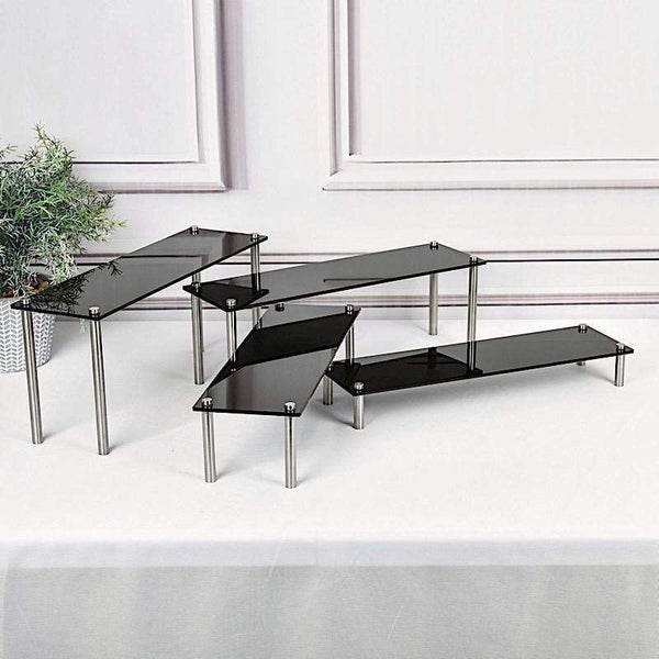 Celebrate your day with dessert stands that are both decorative and functional! Lines of acrylic panels with high quality chrome metal feet come together in these elegant dessert stands. Whether used individually or arranged in ascending order like a waterfall design, these stylish stands with varying heights will create a modern display or centerpiece for your weddings, birthdays, parties or any special gatherings. Use it for your appetizers, desserts, favors, sweet treats or pair it with candles, small floral arrangements, plants, succulents and fairy lights for outstanding dessert table decorations. This set also makes a perfect gift for family and friends. WHAT YOU GET: Each order is for four (4) dessert stands. There are 4 different sizes. Measurements: Stand A: approx. 16 inches long x 4.5 inches wide x 6.5 inches tall. Stand B: approx. 16 inches long x 4.5 inches wide x 5 inches tall. Stand C: approx. 16 inches long x 4.5" inches wide x 3.25 inches tall. Stand D: approx. 16 inches long x 4.5 inches wide x 1.75 inches tall. Acrylic panel thickness: approx. 3mm. Metal foot diameter: approx. 0.5 inch. Material: Acrylic and metal. Use individually or arrange together. Requires small assembly. Please remove the thin films on each side of each acrylic panel prior to assembly. Cupcakes and other decorations are not included.