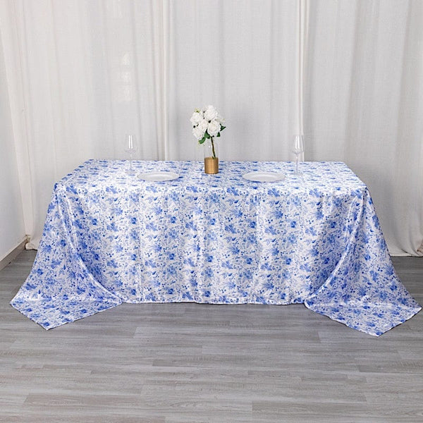 90x132 in White Satin Rectangle Tablecloth with Blue Floral Print