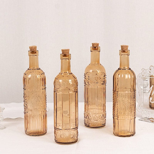 4 Amber Gold 16 oz Vintage Embossed Glass Bottles with Corks