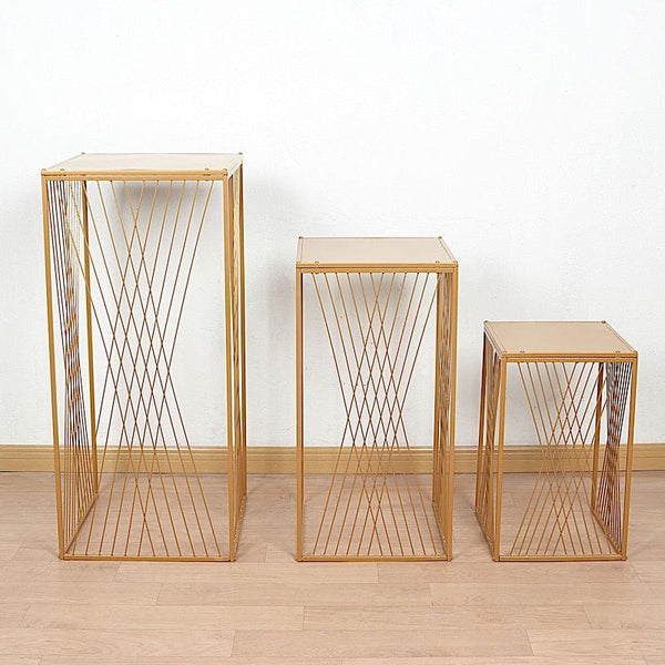 3 Gold Metal Pedestal Stands with Geometric Crossed Lines Pattern