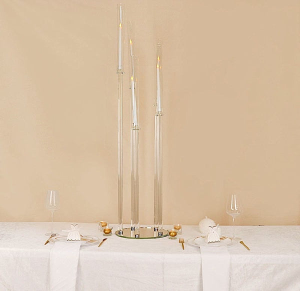 This elegant glass candelabra candle holder is the perfect pick to bring a sense of ambiance to any room or space. Featuring a clean, crystal-like look from top to bottom, this stylish glass piece is an ideal addition to your wedding, party or event decorations. Designed with a round mirror base, stems with varying heights and 5 round glass shades to secure your taper candles. This candelabra candle holder will be a great centerpiece for your event tables. The possibilities are endless! WHAT YOU GET: Each order is for one (1) candelabra candle holder. With a total of 5 candle shades. Measurements: Height: approx. 51 inches. Width: approx. 12 inches. Candle shades: approx. 15.4 inches tall x 1.75 inches wide x 2mm thick. Candle cups: approx. 3.25 inches tall x 2 inches wide bottom x 1.5 inch wide top. Round base size: approx. 12 inches wide x 10mm thick. Stem sizes: approx. 24 - 36.5 inches tall x 1 inch wide. Material: Crystal. Requires small assembly. Candles and other decorations are not included. Glass Care: Before using, handwash each glass piece with warm soapy water and rinse well to remove any dust and dirt that accumulated during transit. Dry using a lint-free cloth. A 50/50 vinegar and water solution can be used to clean the glass for maximum finish and clarity. Rinse and dry well after a few hours. Cleaning using the dishwasher is not recommended.