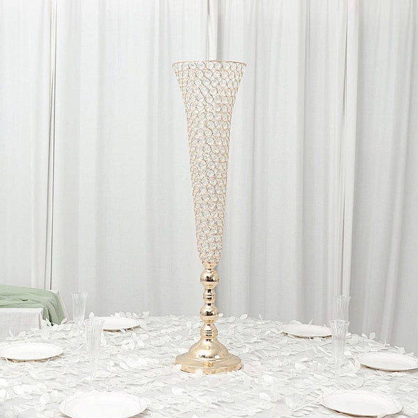 Decorate your special day with dazzling crystal-beaded trumpet metal vases! Whether showcasing hydrangeas, putting roses on display, or simply shining solo, these eye-catching vases are sure to add an extra visual appeal. Our vases are great for weddings, parties, events or simply using them in your own home. Place these elegant vases on an entryway table or used them as centerpieces during dinner to create a perfect focal point for your decor. WHAT YOU GET: Each order is for two (2) vases. Measurements: Height: approx. 40 inches. Base diameter: approx. 8.75 inches. Depth: approx. 25 inches. Top opening: approx. 9.5 inches. Acrylic crystal width: approx. 0.5 inch. Material: Metal and acrylic crystals. The vase top and the base come unattached to avoid damage during transit. Simply use a soft cloth to clean and dry. Flowers and other decorations are not included.