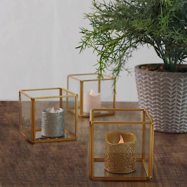 These elegant candle holders with glass panels and metal frames are versatile and easy to pair with other tabletop decorations. These multipurpose candle holders can also hold flowers, small plants, or any vase fillers to create your unique style. Perfect to complement any table, entryway, dining room or anywhere else with a fun, fancy touch of light. Great for weddings, events, and parties as centerpieces, or simply as decorative pieces for your home. WHAT YOU GET: Each order is for three (3) candle holders. Measurements: Height: approx. 3 inches. Width: approx. 3 inches. Material: Metal and glass. Candles, flowers and other decorations are not included.