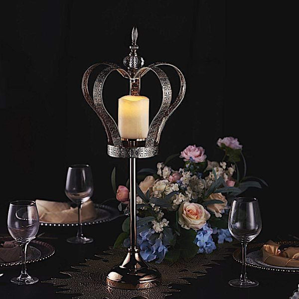 Whether for weddings or princess themed parties, this crown candle holder can be used on its own as a centerpiece or it can be paired with elegant candles and flowers, LED lights and more. Featuring a metal stand with a removable crown top and round glass votive candle holder, this multipurpose candle holder stand will add sparkle to your big day and impress your guests with an elegant touch for your party tablescapes. Also great as a gift or keepsake for family and friends. WHAT YOU GET: Each order is for one (1) candle holder stand. Measurements: Width: approx. 10 inches. Height: approx. 25 inches. Crown size: approx. 12.75 inches tall x 10 inches wide x 1mm thick. Glass holder: approx. 4 inches tall x 3 inches wide x 2 mm thick. Base: approx. 5.5 inches wide. Shipped unassembled. Easily attach 4 parts together. Material: Metal and glass. Flowers, candles and other decorations are not included.