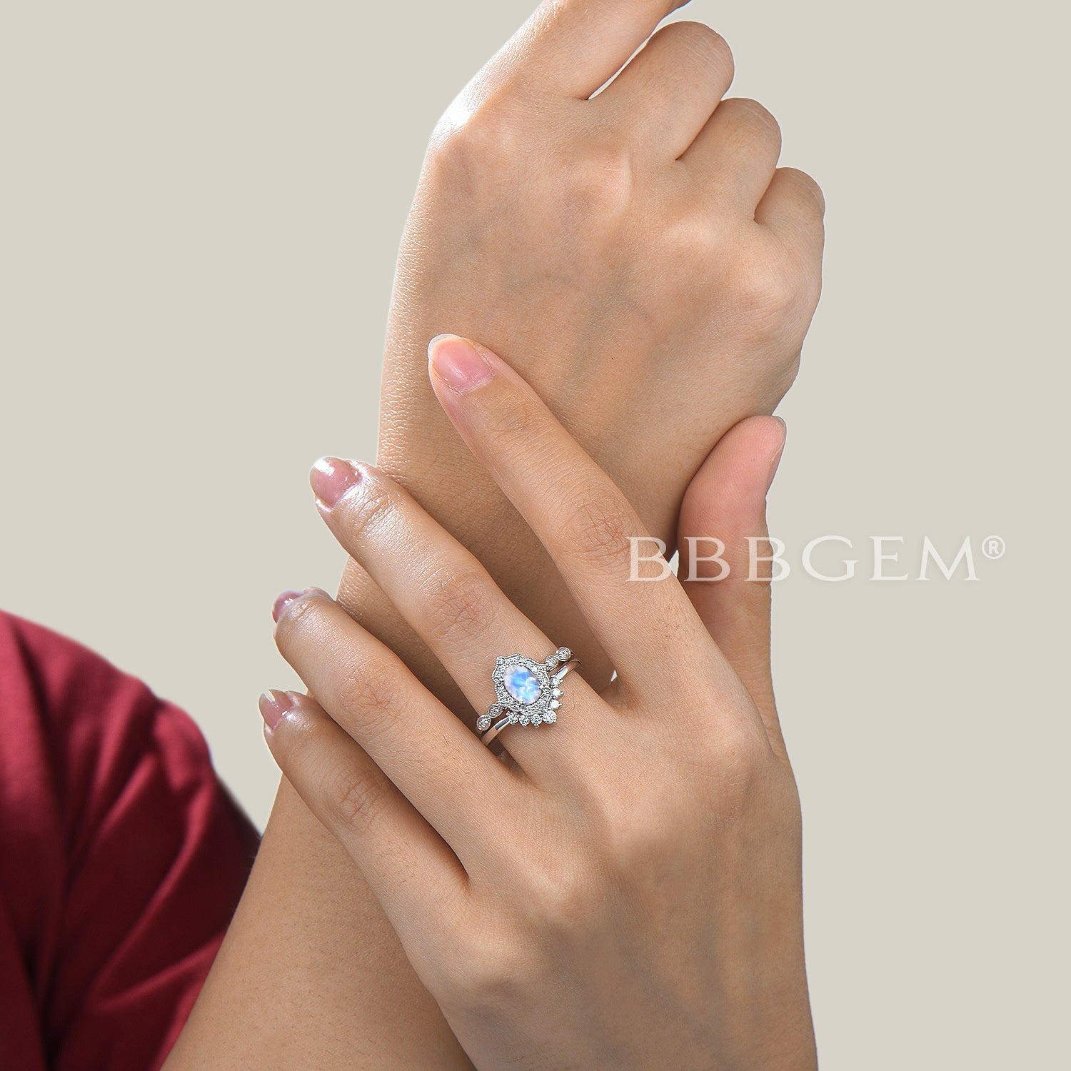 14K/18K Rose Gold Rainbow Vintage Milgrain Moonstone Diamond Bridal Set