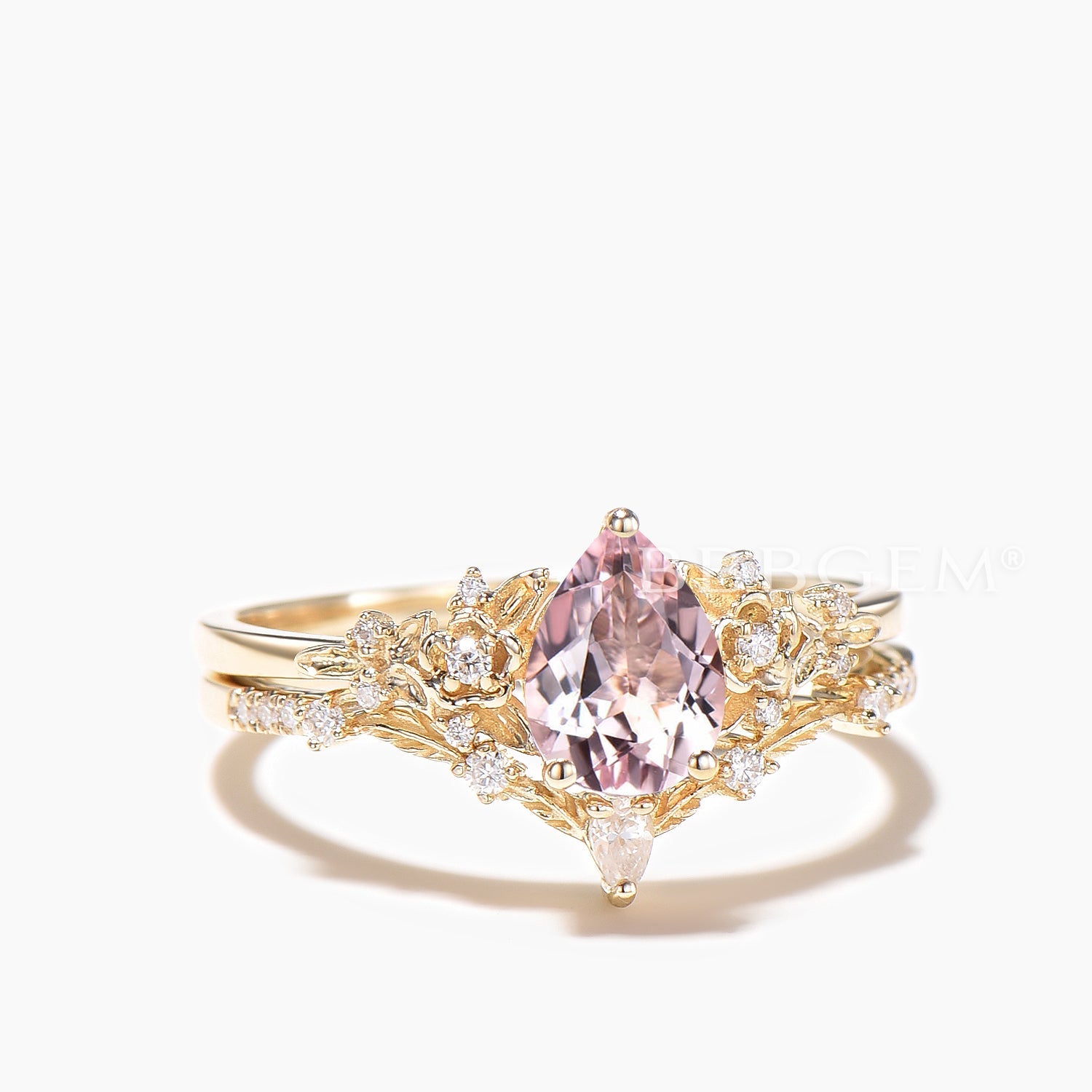1.25CT Teardrop Cut Natural Morganite Flower Wedding Ring Moissanite Bridal Set