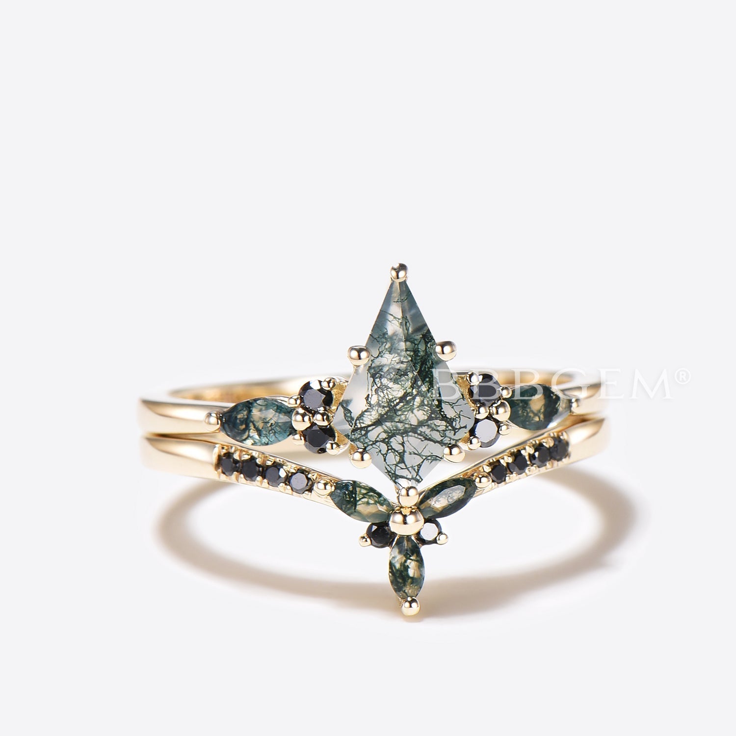 Kite Cut Moss Agate Engagement Ring Set Cluster Black Spinel Ring
