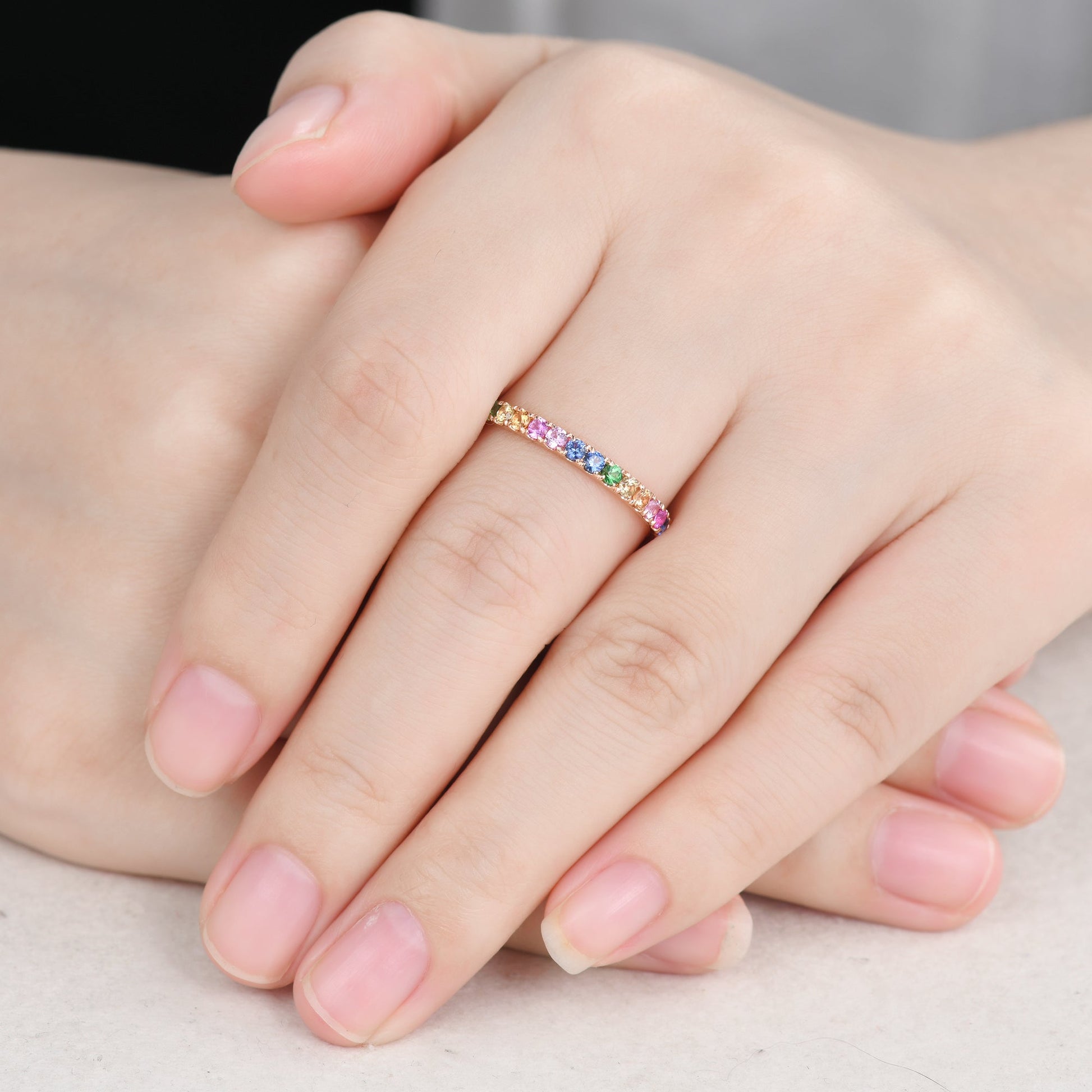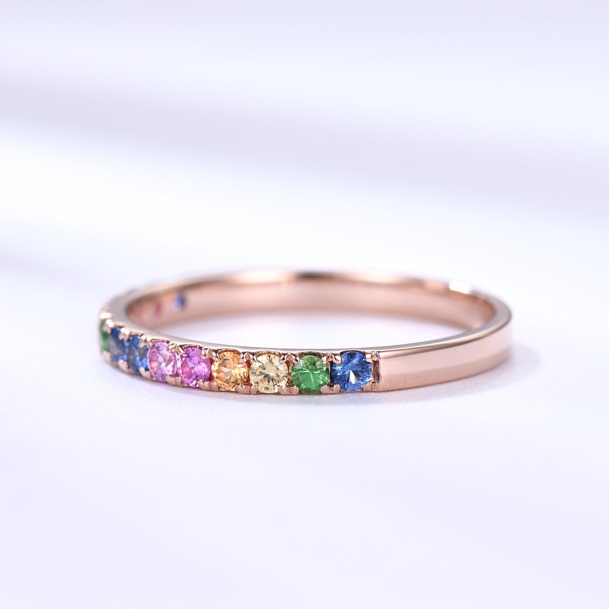 2mm Rainbow Sapphire Wedding Band 14k Rose Gold Half Eternity Women Band