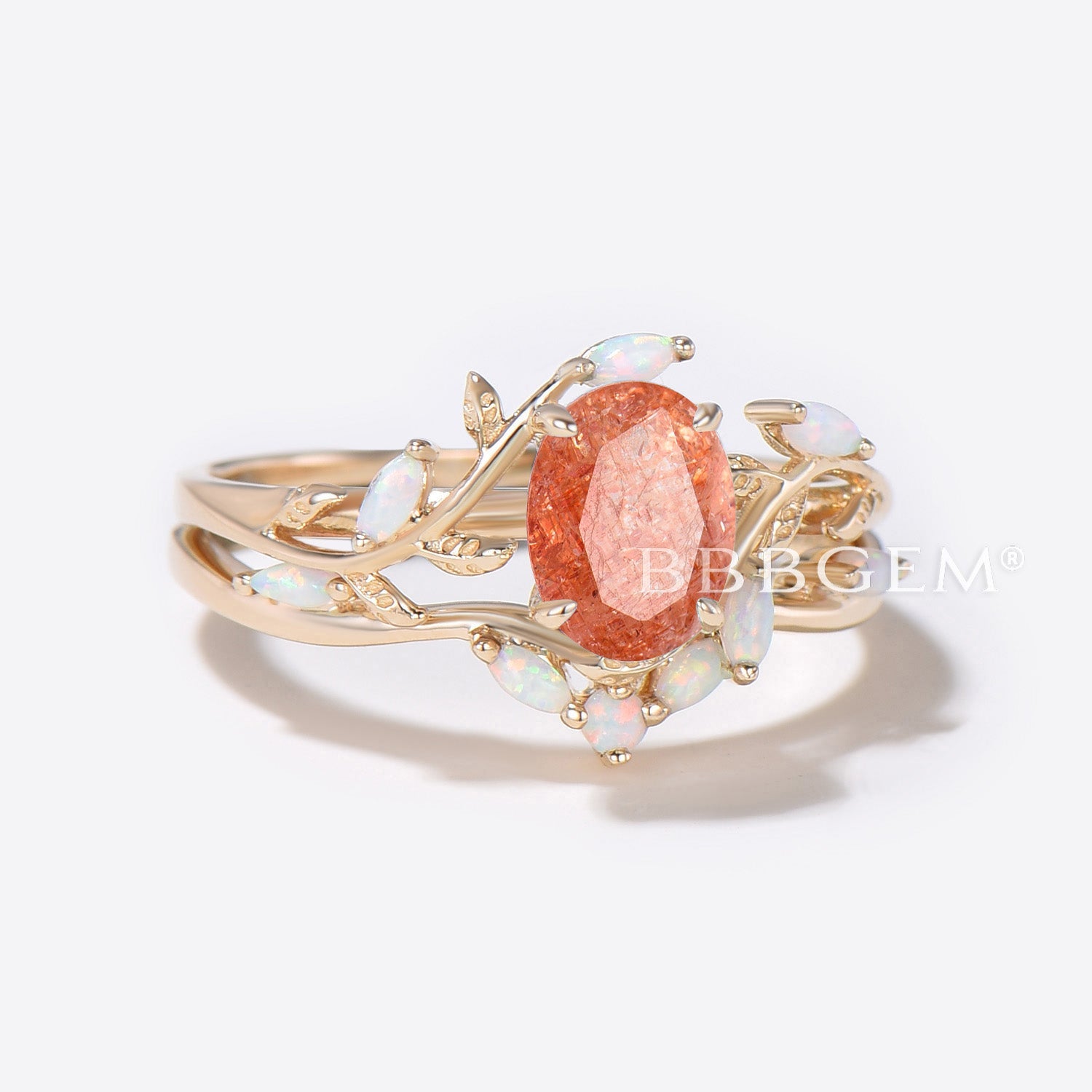 1.5ct Oval Sunstone Engagement Ring Gold Leaf Vine Opal Wedding Ring