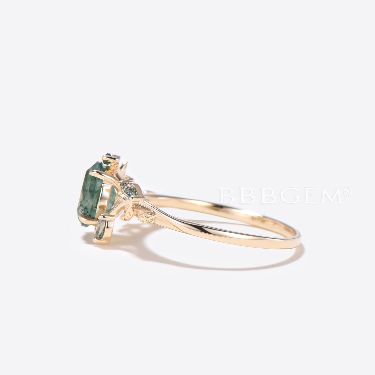 14K Gold Leaf Oval Natural Moss Agate Engagement Ring Branch Vine Ring