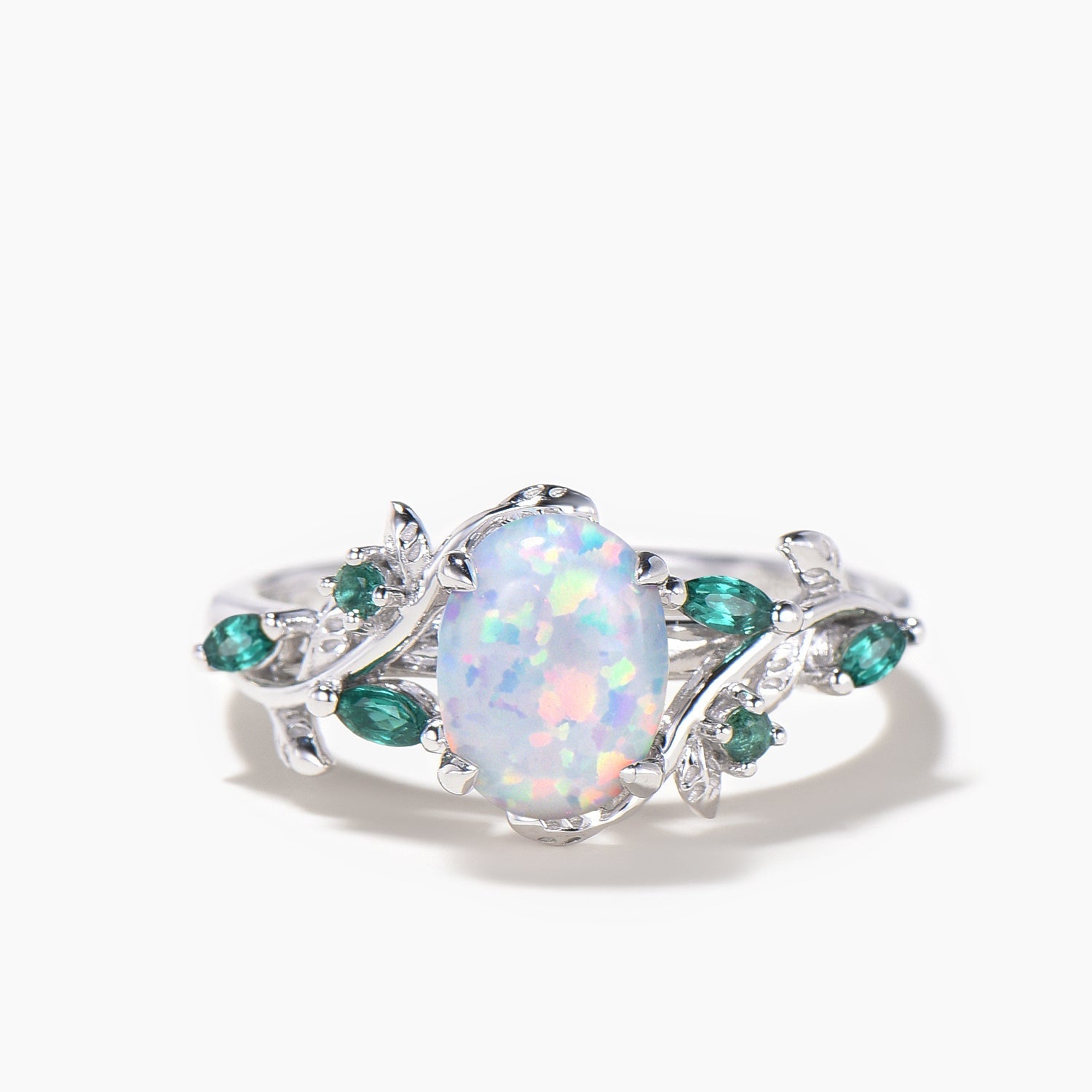 1.5CT Oval White Opal Leaf Engagement Ring Emerald Nature Inspired Bridal Set