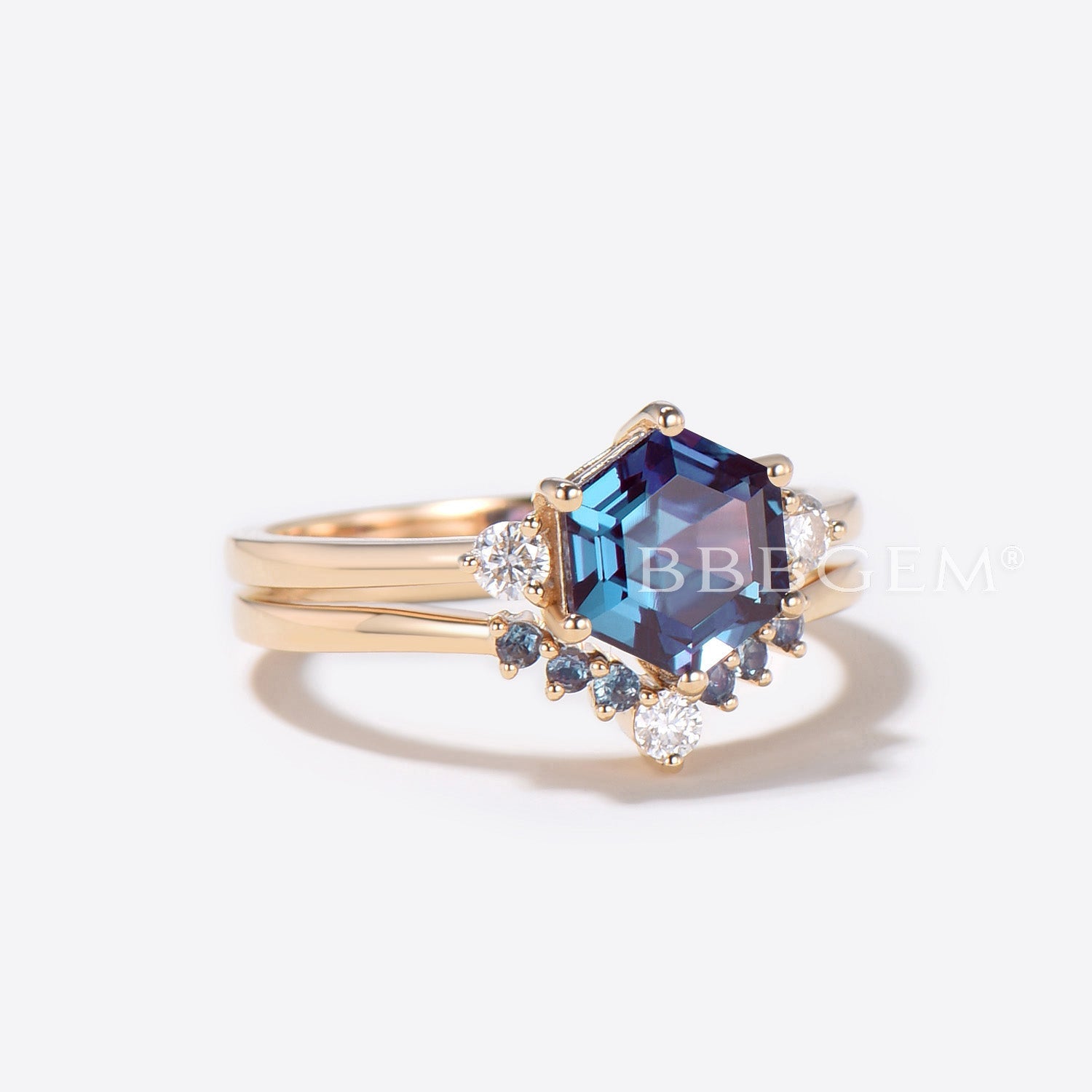 Hexagon Cut Alexandrite Engagement Ring 10k Gold 2pcs Bridal Set