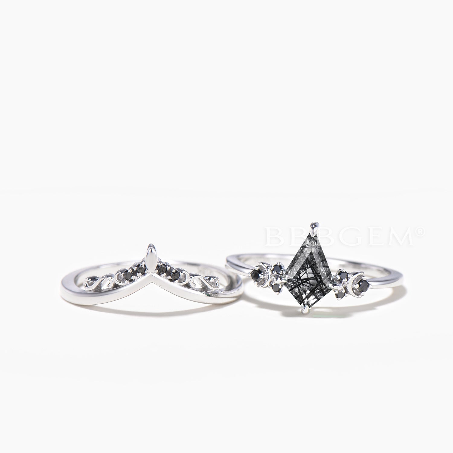 Kite Cut Natural Black Rutilated Quartz Engagement Ring Spinel Celestial Bridal Set