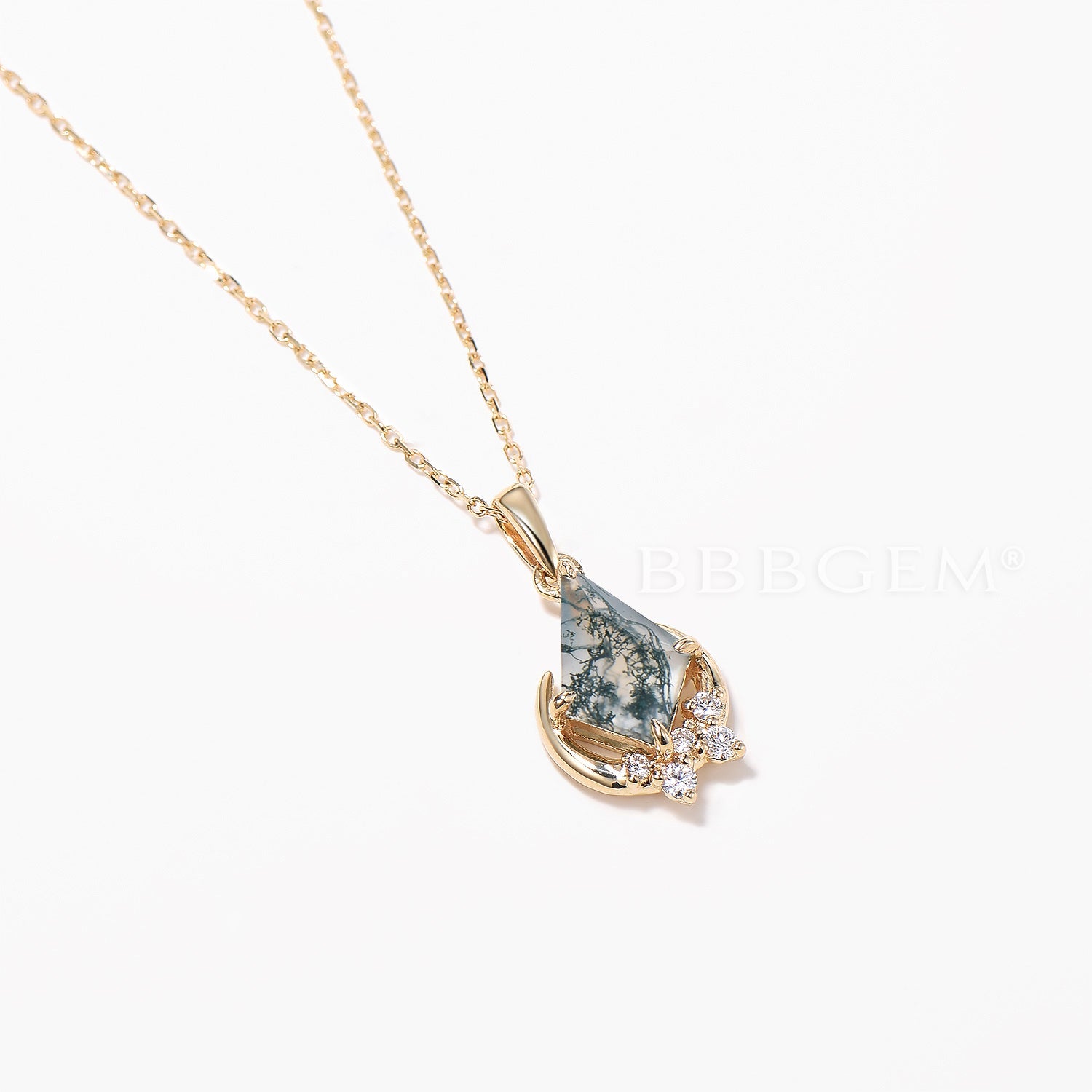 Kite Cut Natural Moss Agate Necklace Diamond Cluster Moon Yellow Gold Pendant