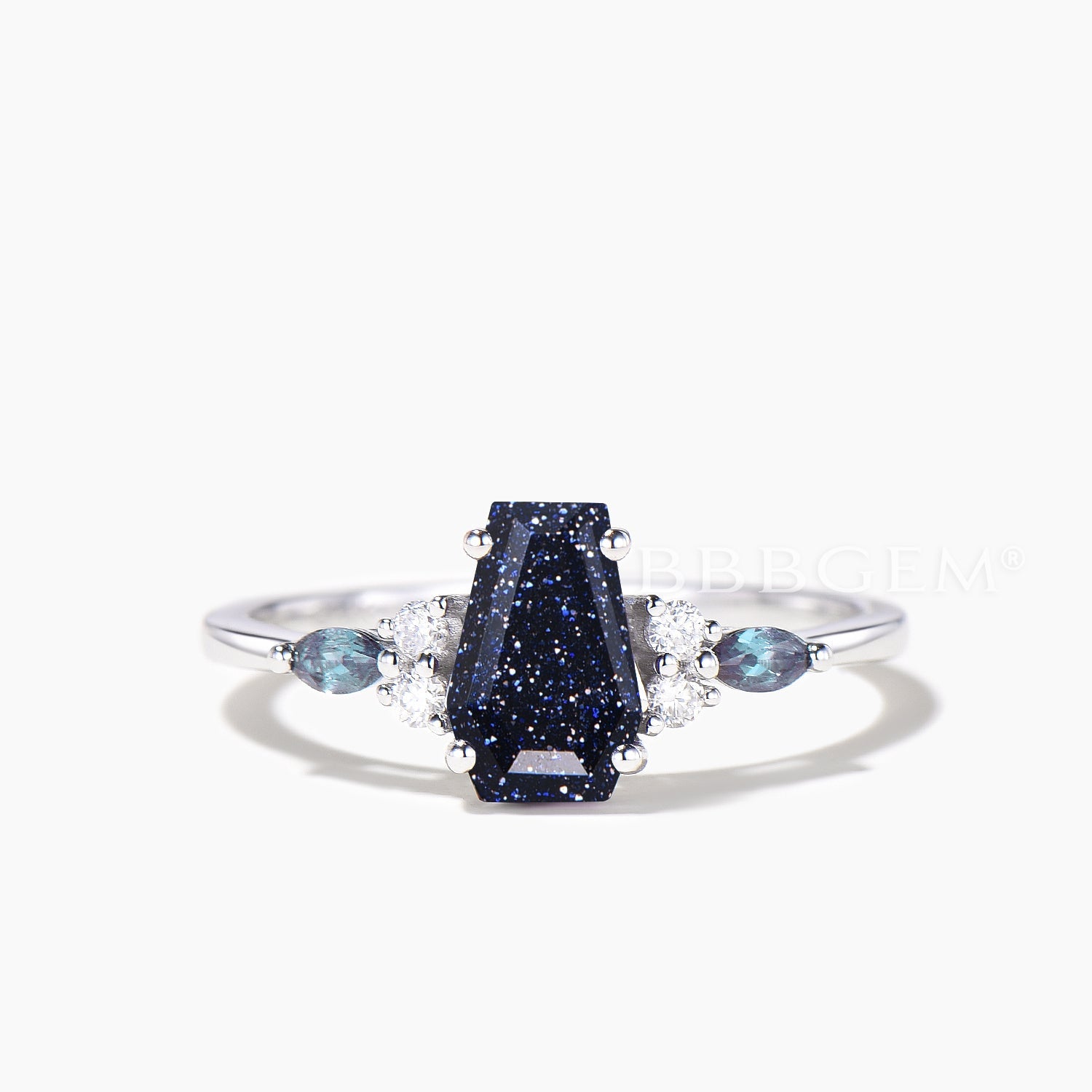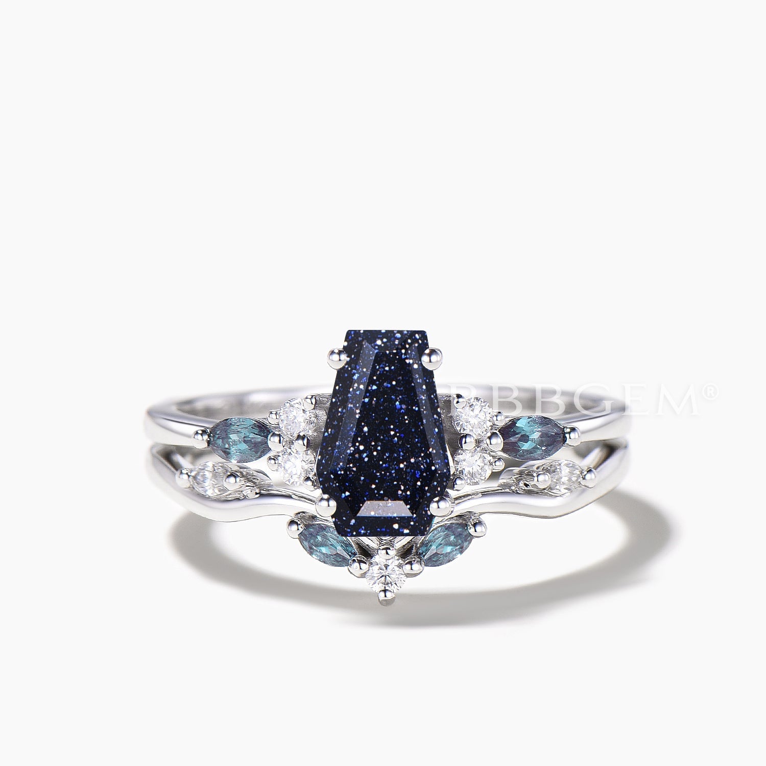 3pcs Coffin Blue Sandstone Cluster Bridal Set Alexandrite Diamond Engagement Ring