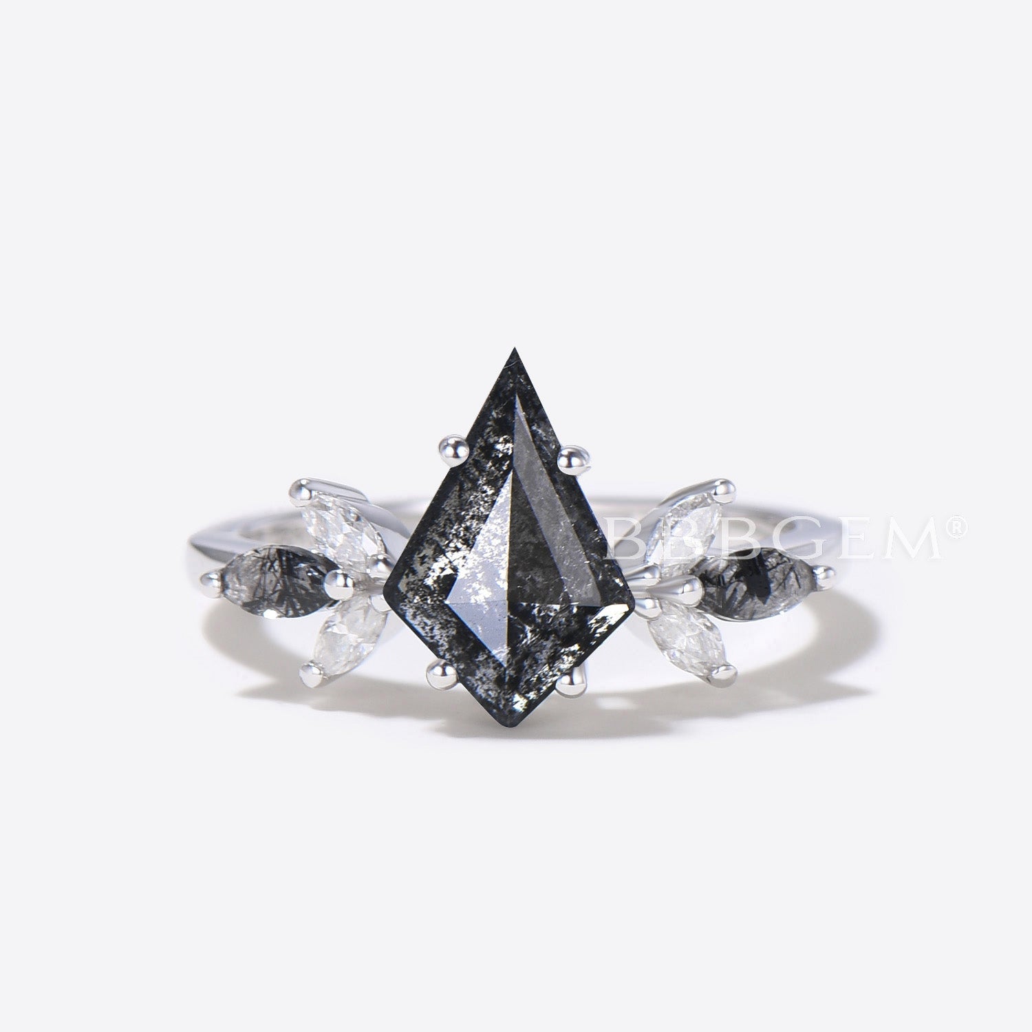 Kite Cut Natural Salt and Pepper Diamond Black Rutilated Quartz Cluster Bridal Ring Set