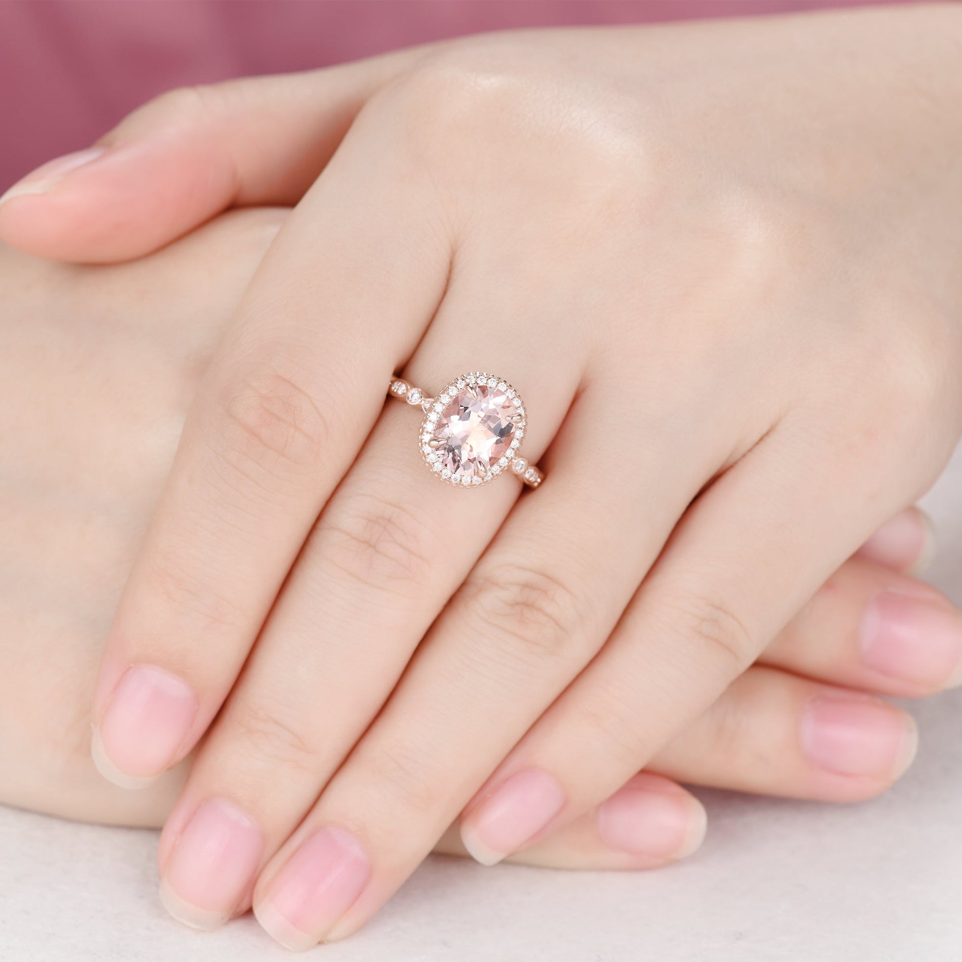 Hidden Halo 8x10mm Vintage Oval Peach Morganite Engagement Ring Rose Gold Art Deco Ring