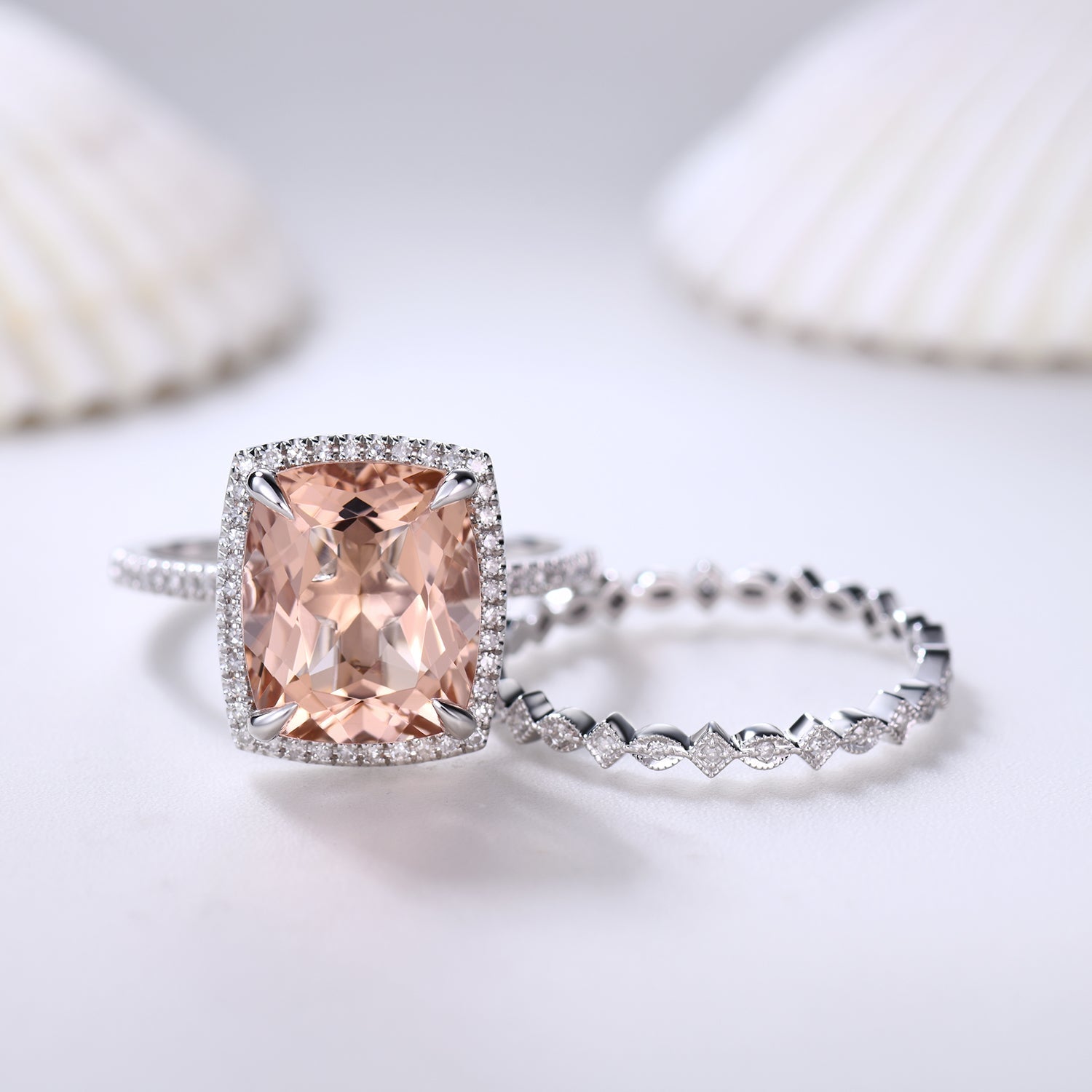 14K White Gold Big Cushion Cut Morganite Engagement Ring Set Art Deco Diamond Band