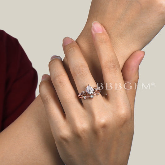 Featuring a radiant pear-shaped moissanite centerpiece and a delicately curved diamond band, this bridal set blends timeless sophistication with organic charm.It symbolizes love and elegance, making it a meaningful and stunning choice for your forever moments.