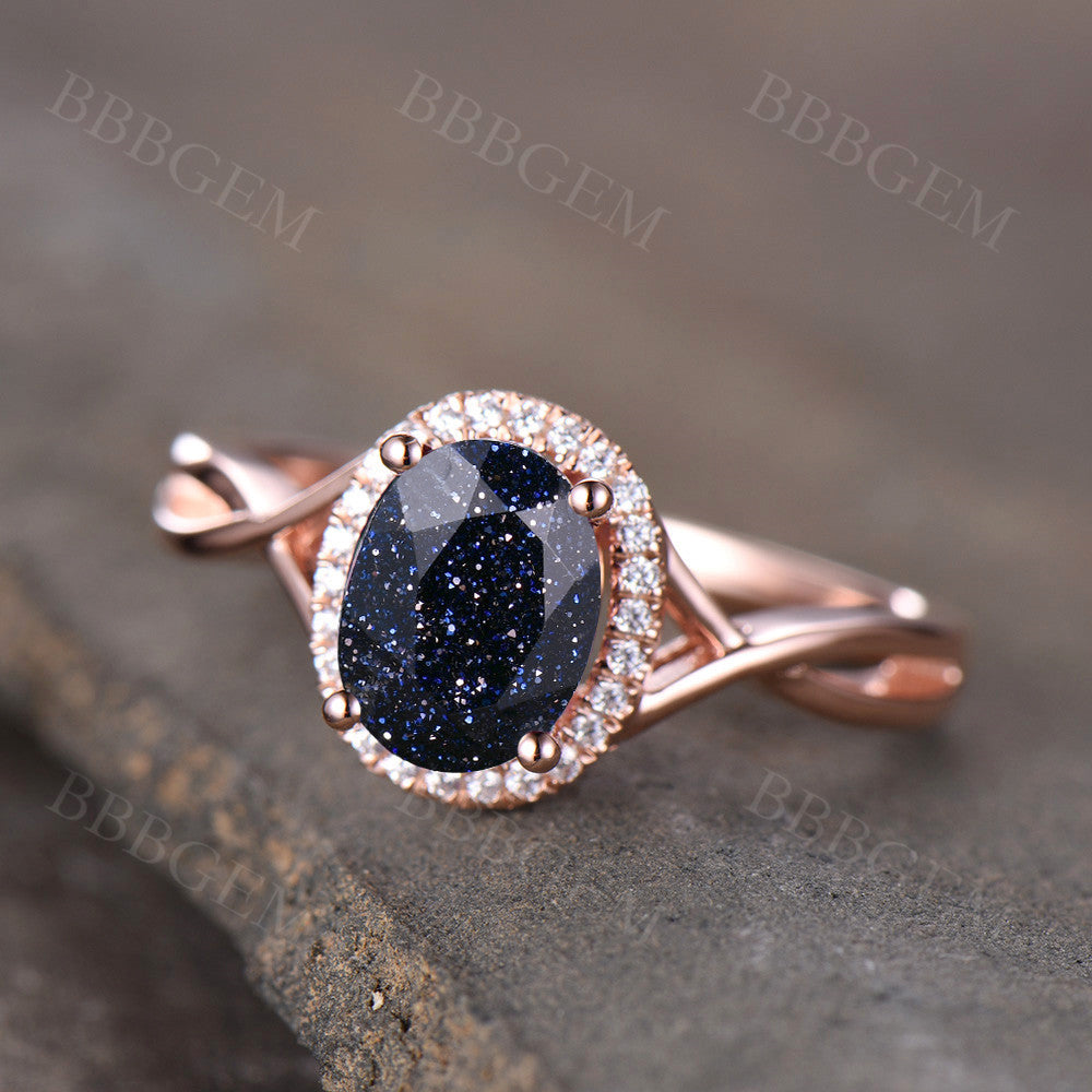 1.5CT Pink Gold Blue Sandstone Wedding Ring Diamond Halo Infinity Plain Gold Band