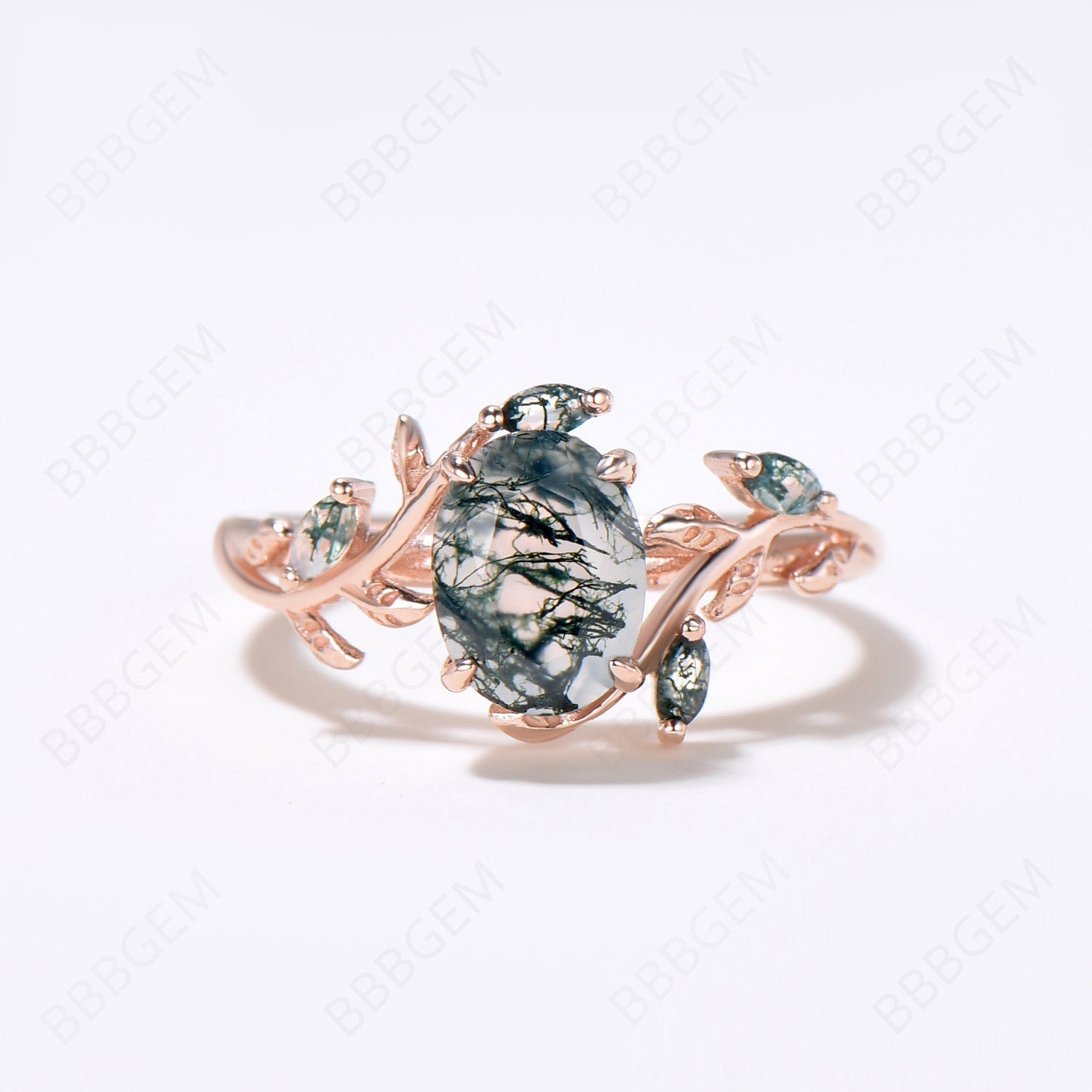 Enchanted Forest: Oval 6x8 Moss Agate Wedding Set in 14K Rose Gold - A Tribute to Nature's Elegance