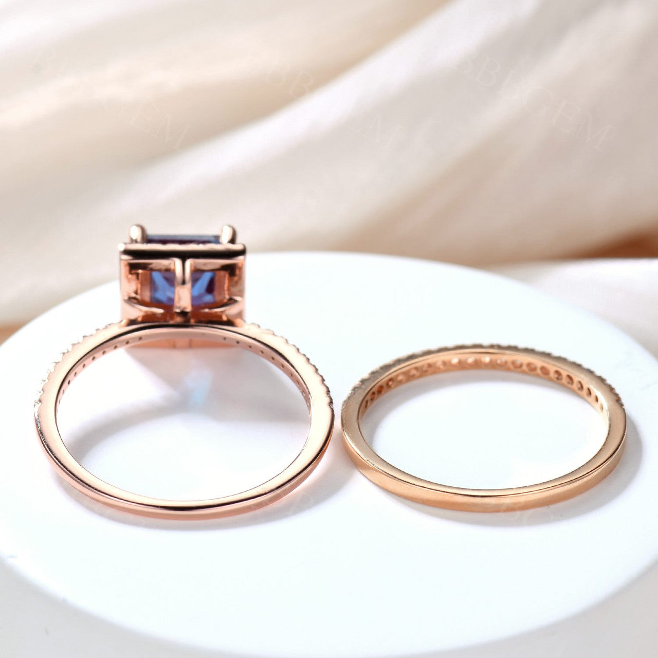 2pcs Alexandrite Bridal Set 6mm Princess Cut Alexandrite Diamond Engagement Ring Set In Rose Gold