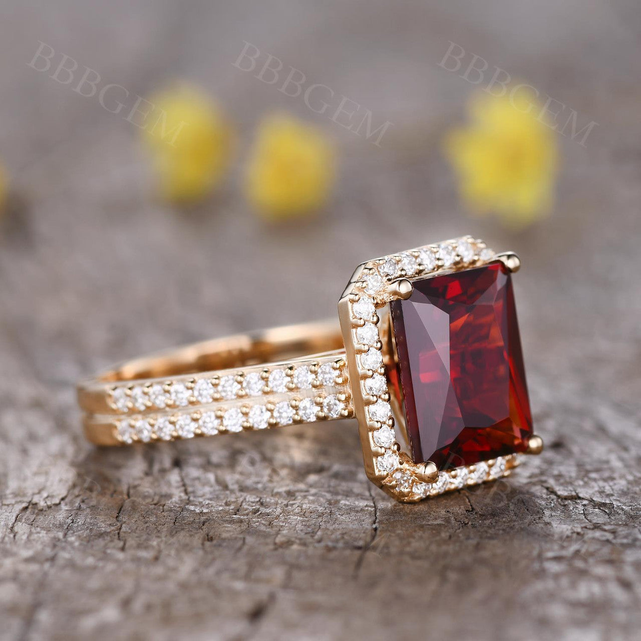 4 Carat Natural Garnet Engagement Ring Yellow Gold Halo Diamond Wedding Band