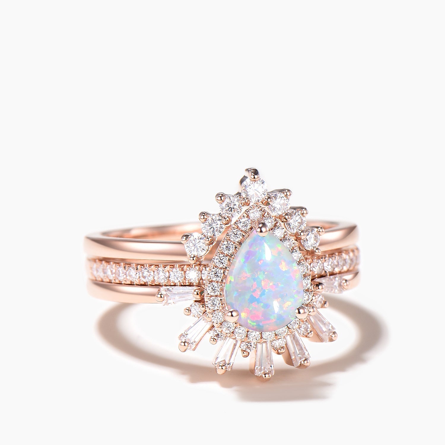 3pcs Pear Cut White Opal Wedding Bridal Set Moissanite Halo Engagement Ring