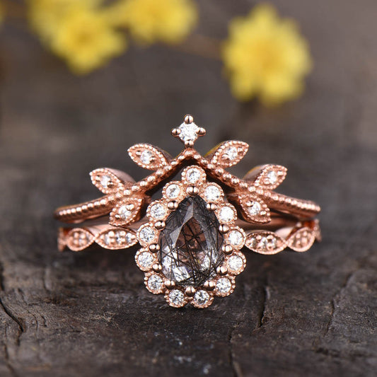 14K/18K Diamond Halo Black Rutilated Quartz Diamond Engagement Rings Wedding Set