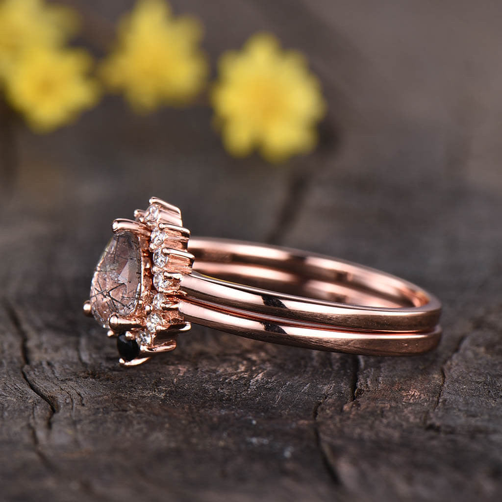 14K/18K Cluster Black Rutilated Quartz Diamond Engagement Ring Set Diamond Wedding Band