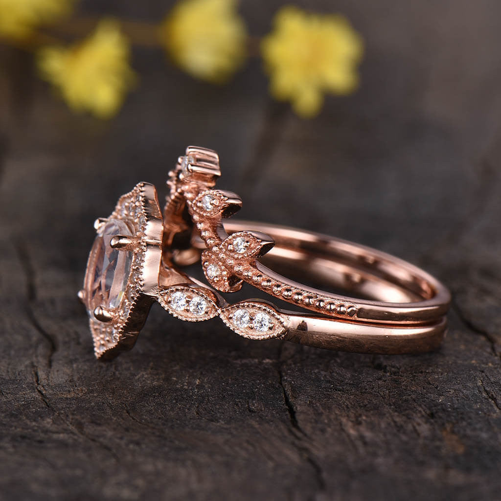 14K/18K Gold Oval Cut Vintage Moonstone Diamond Halo Engagement Ring Set