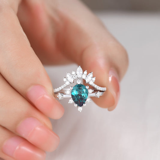 14K/18K Gold Pear Shaped Alexandrite Diamond Art Deco Color Change Engagement Ring Set