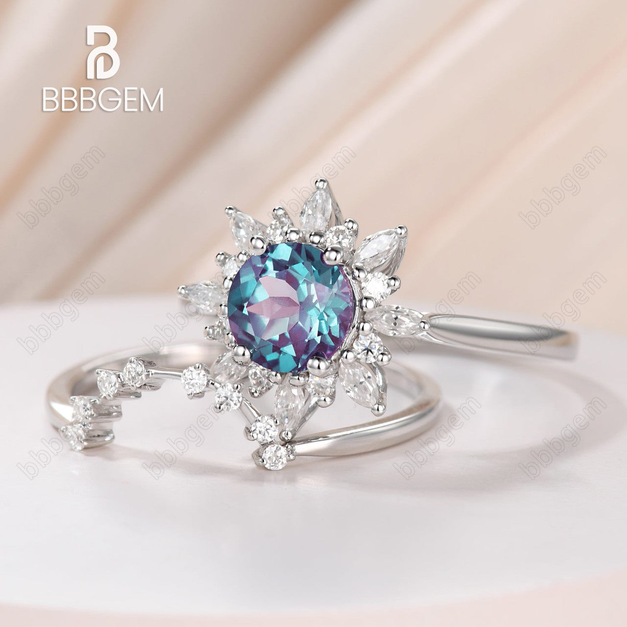 Floral Blue Round Alexandrite Engagement Ring Set 2pcs With Diamond or Moissanite